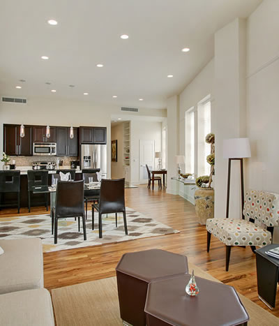 - Contemporary quartz countertops and custom cabinets in kitchens and bathrooms